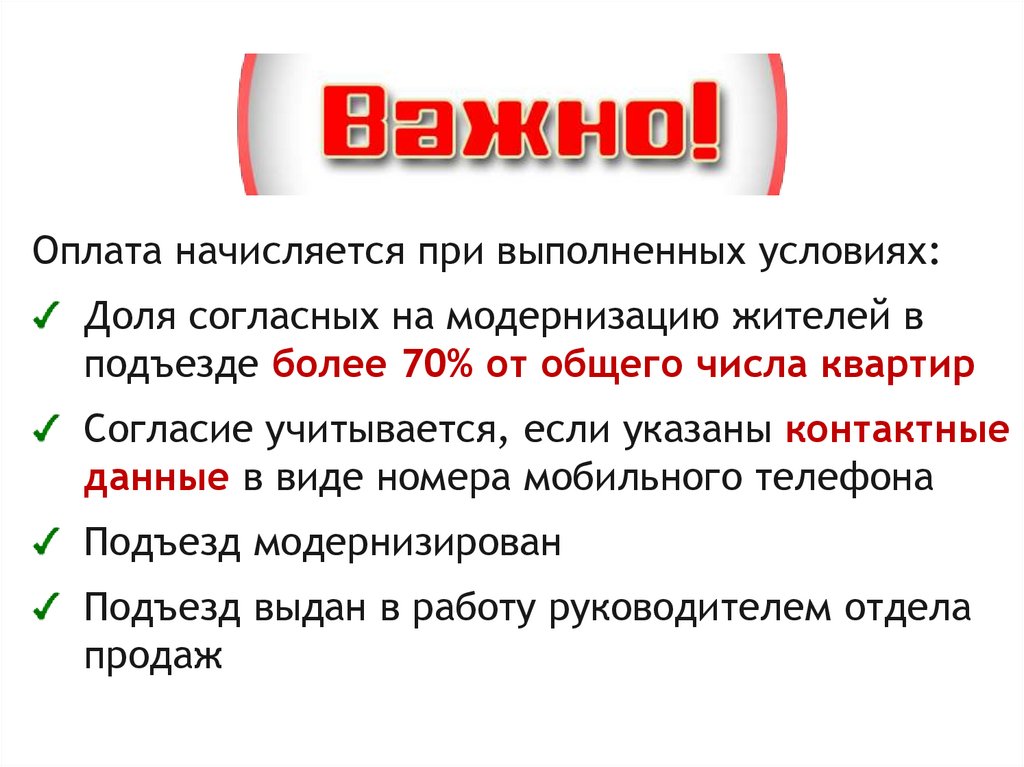Оплата начисляется при выполненных условиях:Доля согласных на модернизацию жителей в