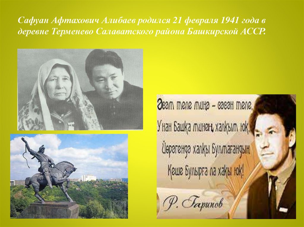 Сафуан Афтахович Алибаев родился 21 февраля 1941 года вдеревне Терменево Салаватского района Башкирской АССР.