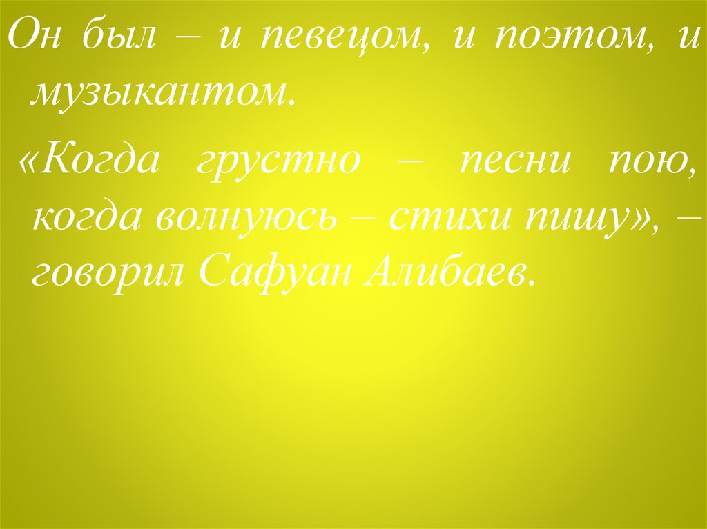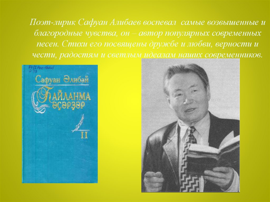 Поэт-лирик Сафуан Алибаев воспевал самые возвышенные иблагородные чувства, он – автор популярных современных