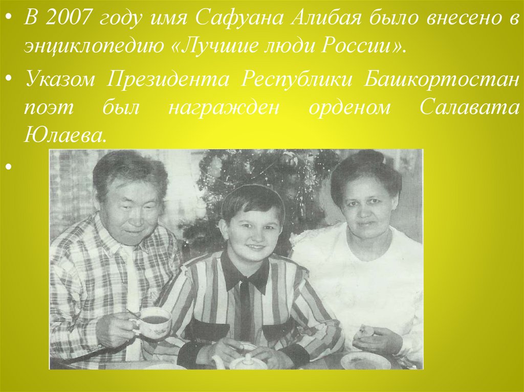 • В 2007 году имя Сафуана Алибая было внесено вэнциклопедию «Лучшие люди России».