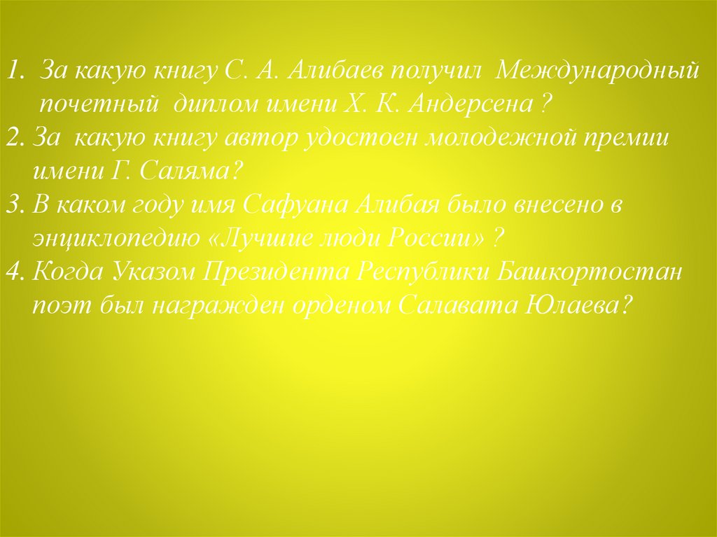 1. За какую книгу С. А. Алибаев получил Международныйпочетный диплом имени Х. К. Андерсена ?