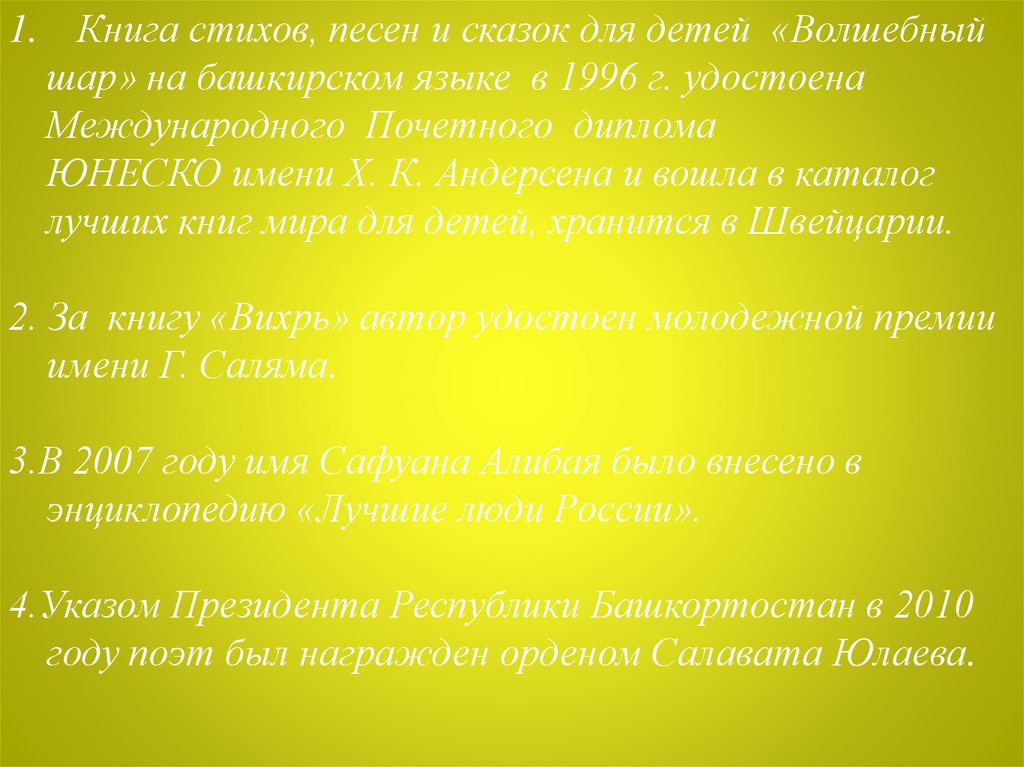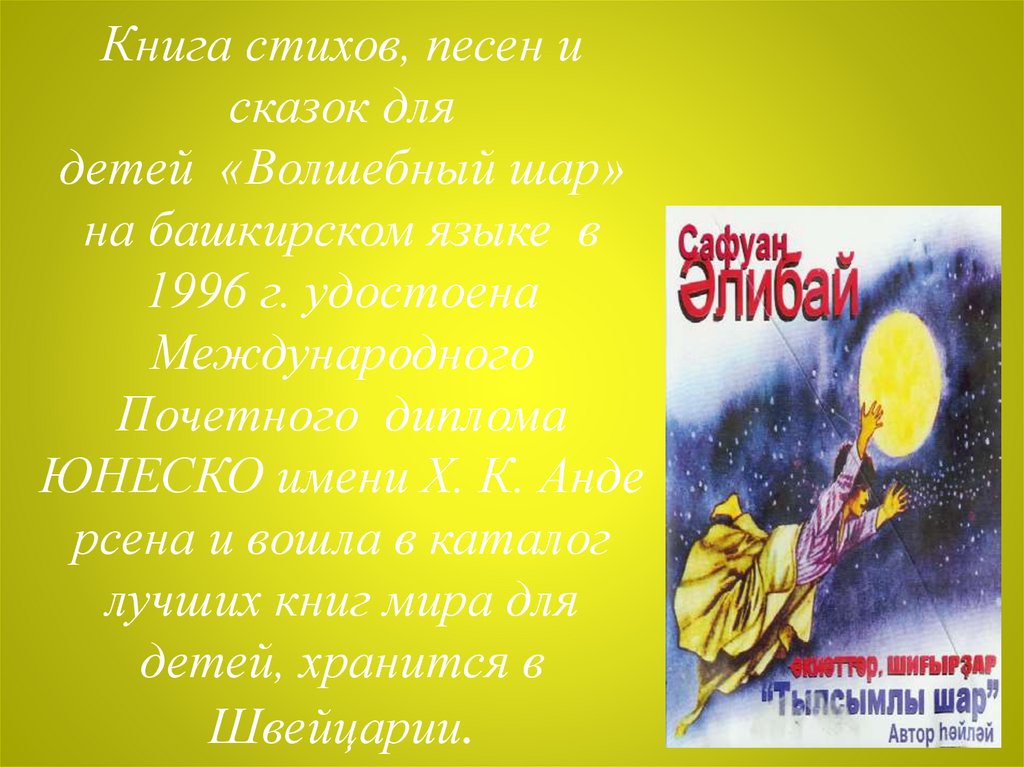 1. Книга стихов, песен и сказок для детей «Волшебныйшар» на башкирском языке в 1996 г. удостоена