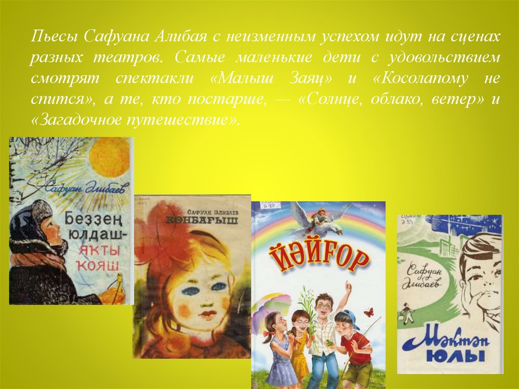 Пьесы Сафуана Алибая с неизменным успехом идут на сценахразных театров. Самые маленькие дети с удовольствием