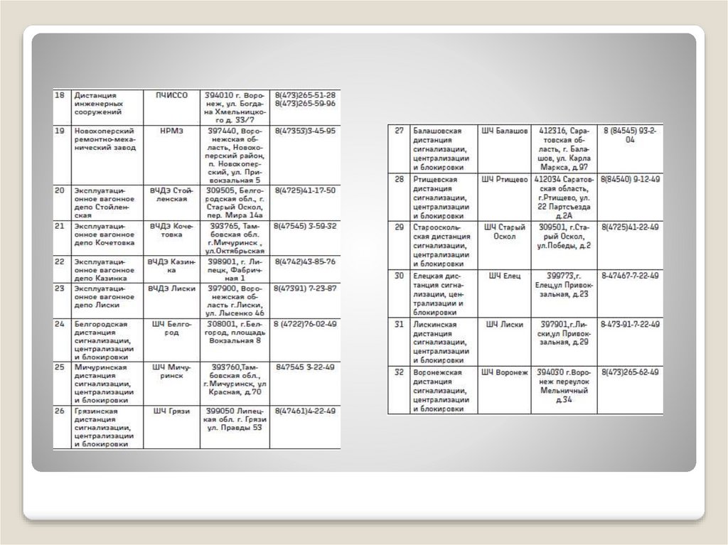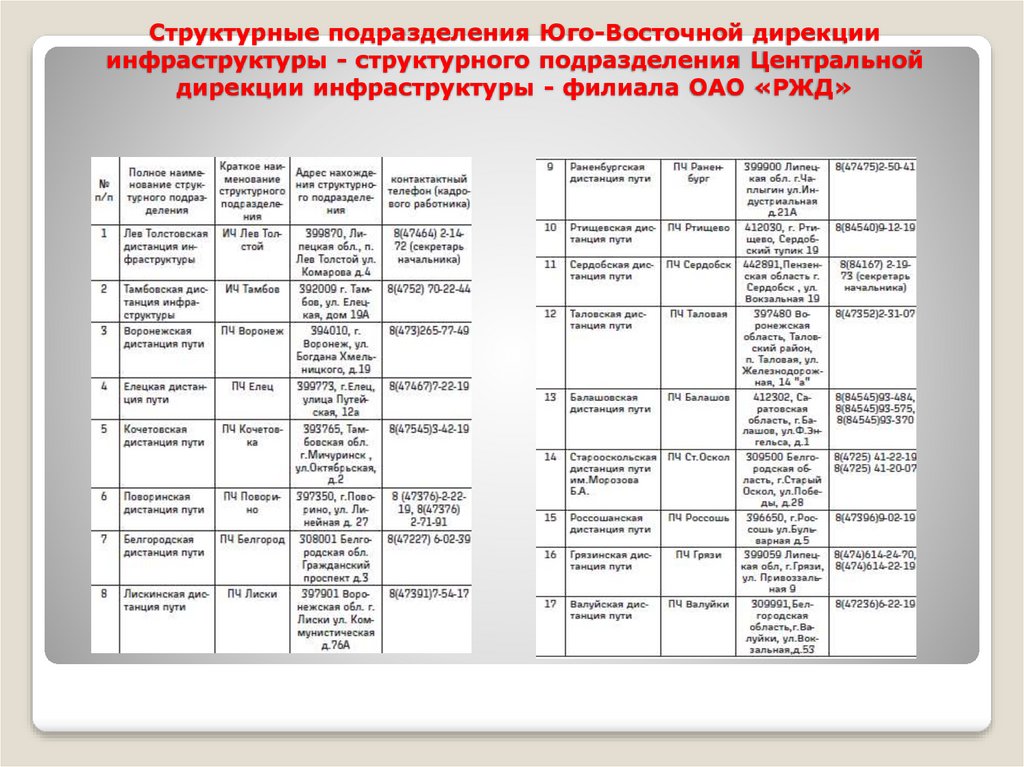 Структурные подразделения Юго-Восточной дирекцииинфраструктуры - структурного подразделения Центральной