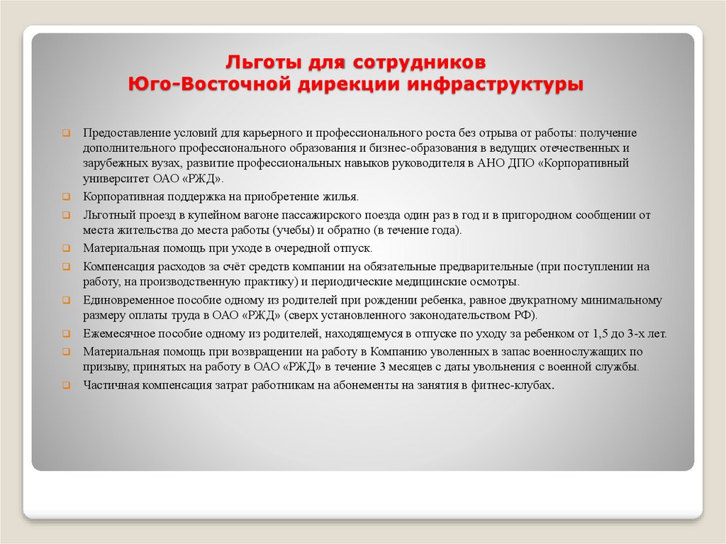 Льготы для сотрудниковЮго-Восточной дирекции инфраструктуры