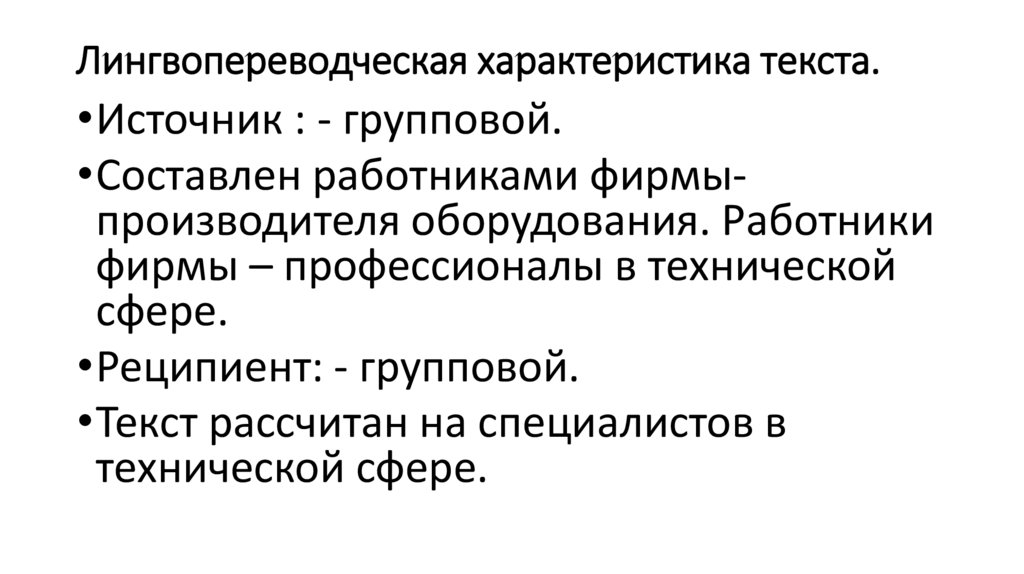 Лингвопереводческая характеристика текста.•Источник : - групповой.