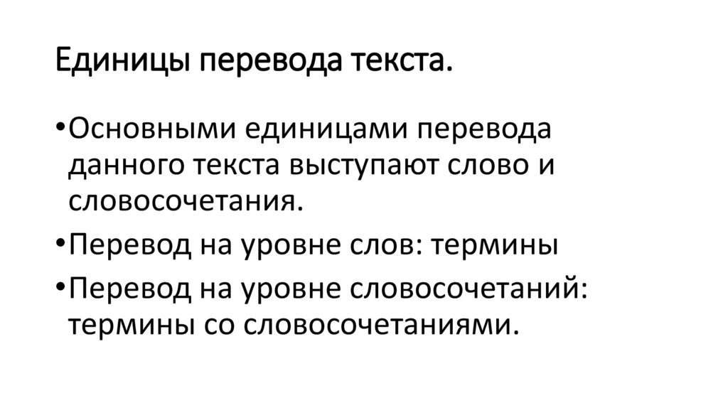 Единицы перевода текста.•Основными единицами перевода