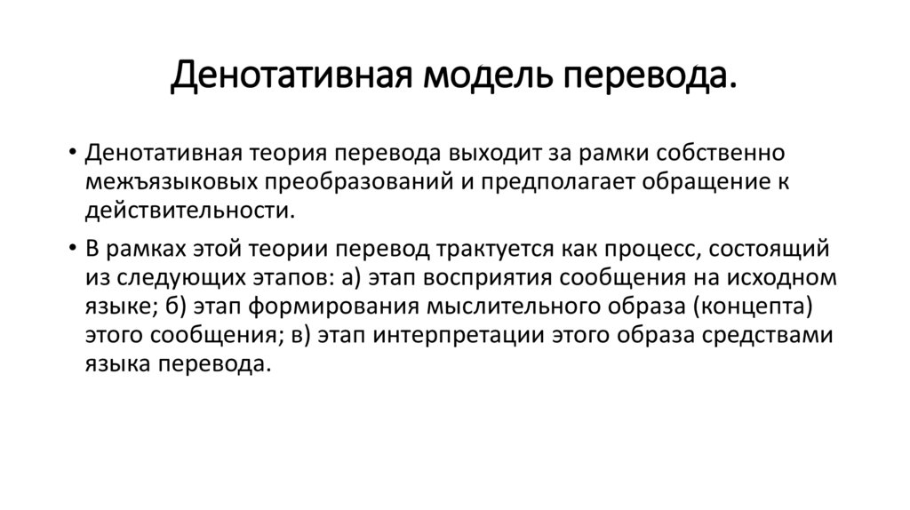 Денотативная модель перевода.• Денотативная теория перевода выходит за рамки собственно