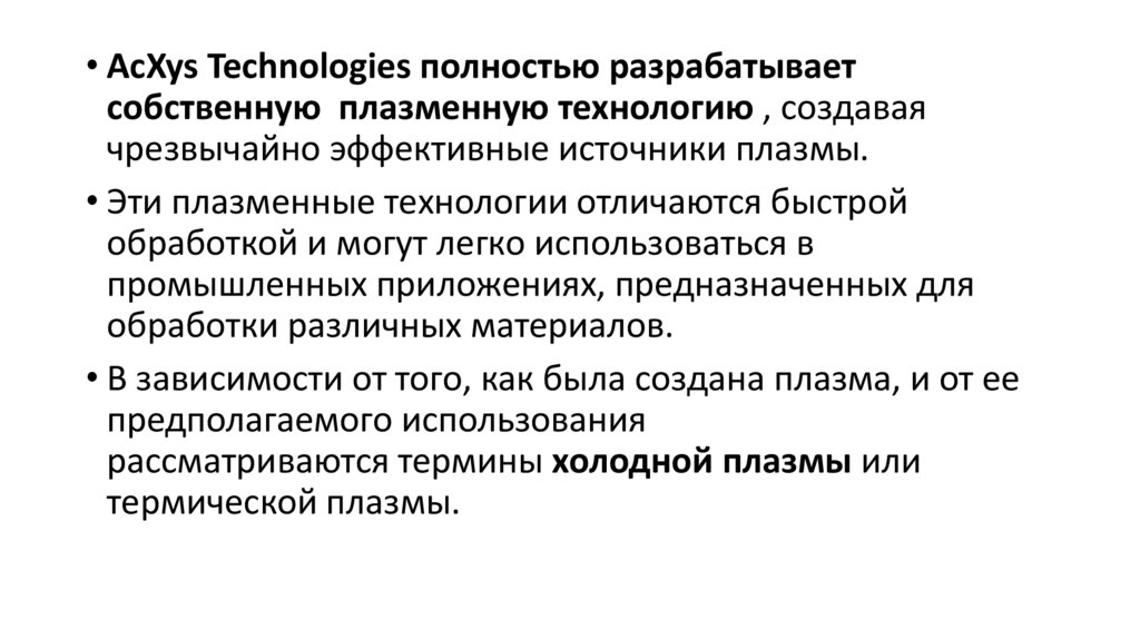 • AcXys Technologies полностью разрабатываетсобственную плазменную технологию , создавая
