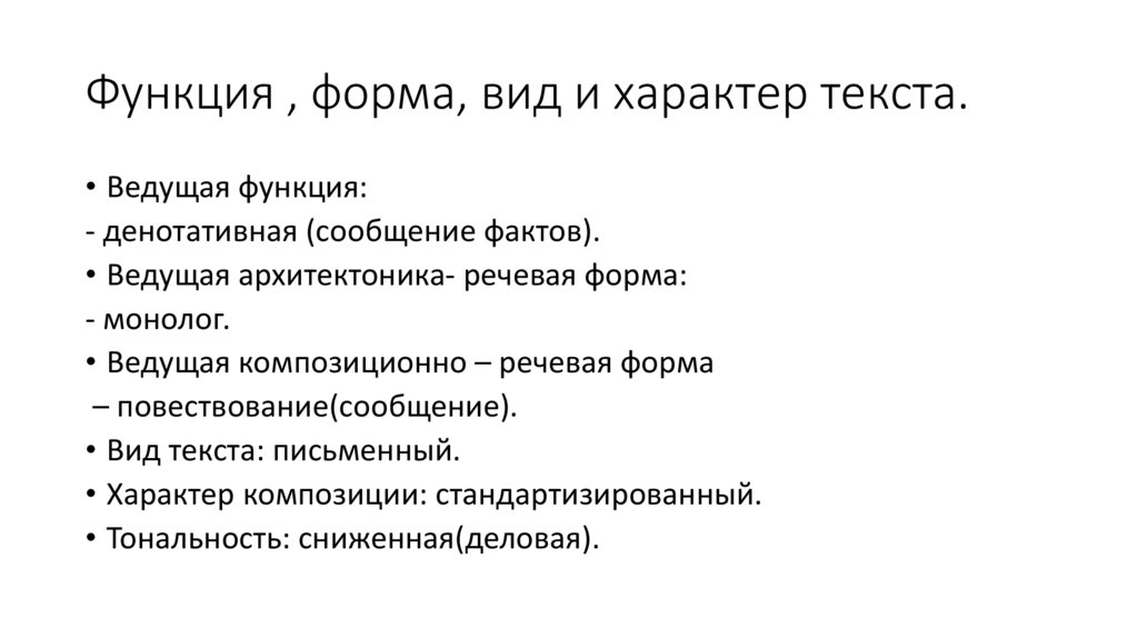 Функция , форма, вид и характер текста.• Ведущая функция: