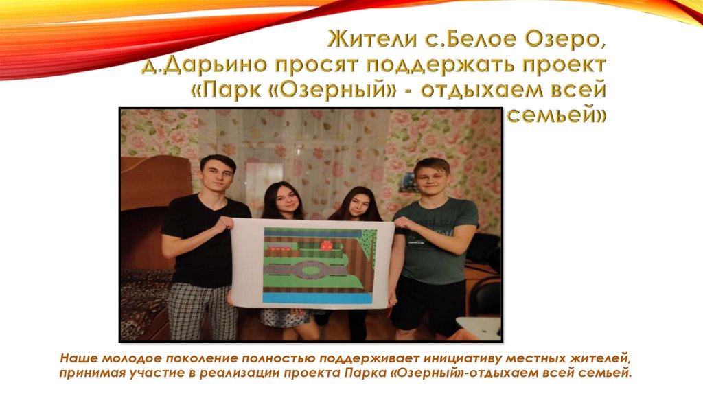 Наше молодое поколение полностью поддерживает инициативу местных жителей,принимая участие в реализации проекта Парка «Озерный»-отдыхаем всей семьей.