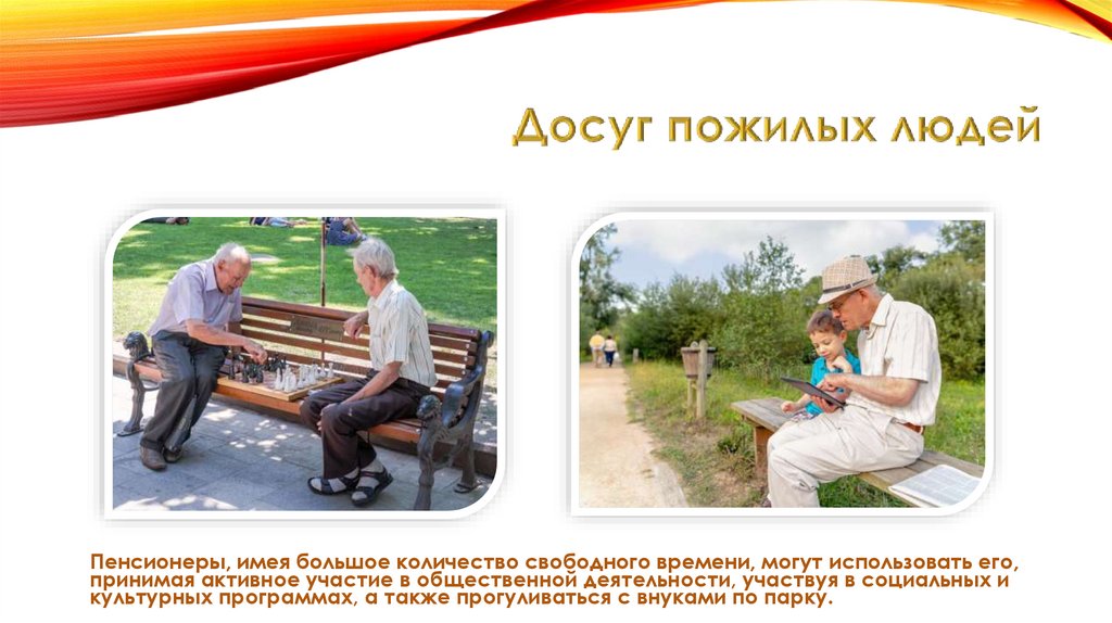 Пенсионеры, имея большое количество свободного времени, могут использовать его,принимая активное участие в общественной деятельности, участвуя в социальных и