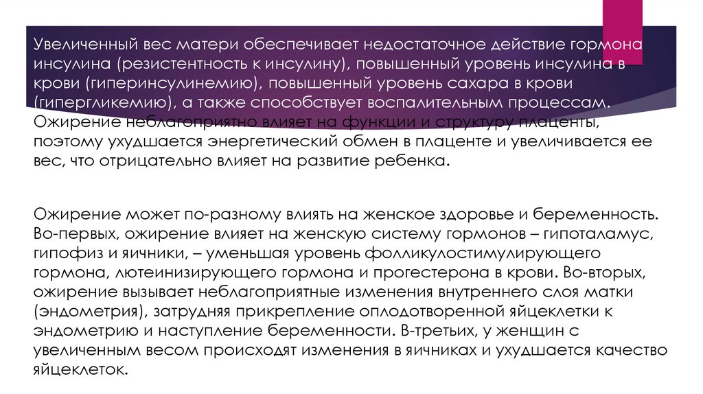 Увеличенный вес матери обеспечивает недостаточное действие гормонаинсулина (резистентность к инсулину), повышенный уровень инсулина в