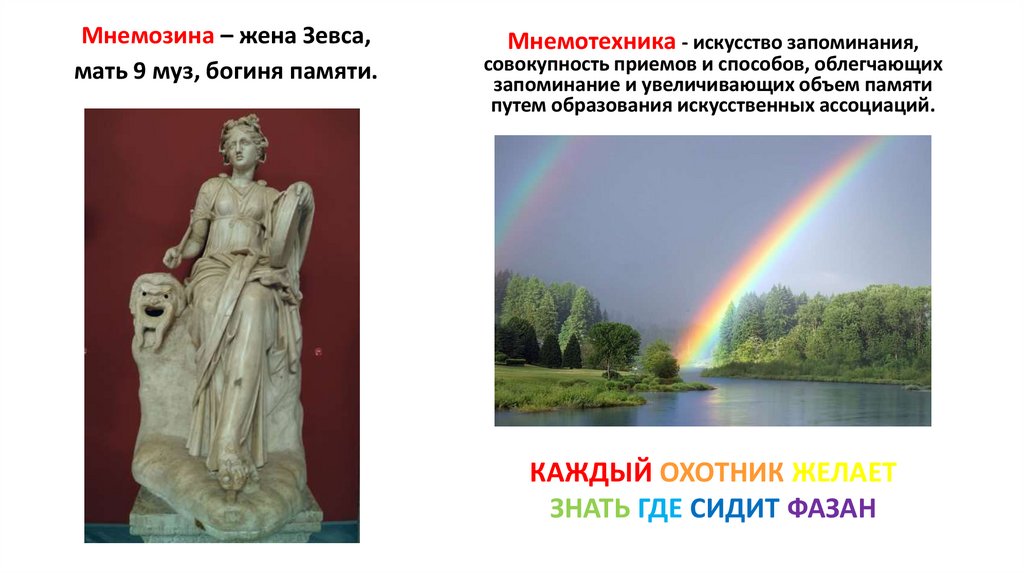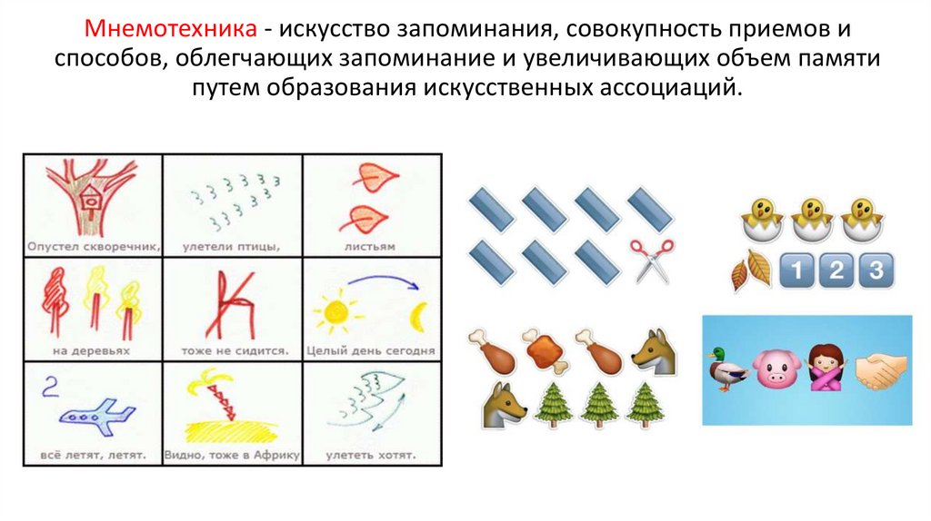 Мнемотехника - искусство запоминания, совокупность приемов испособов, облегчающих запоминание и увеличивающих объем памяти