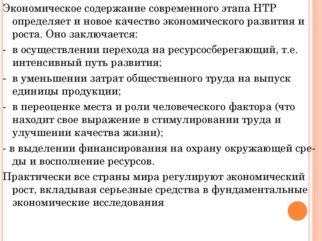 Экономическое содержание современного этапа НТРопределяет и новое качество экономического развития и