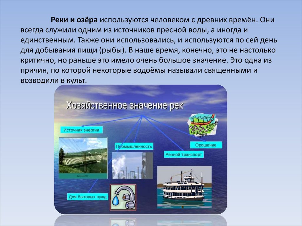 Реки и озёра используются человеком с древних времён. Онивсегда служили одним из источников пресной воды, а иногда и