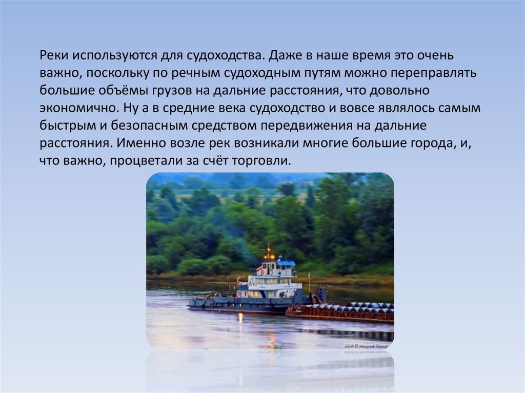 Реки используются для судоходства. Даже в наше время это оченьважно, поскольку по речным судоходным путям можно переправлять