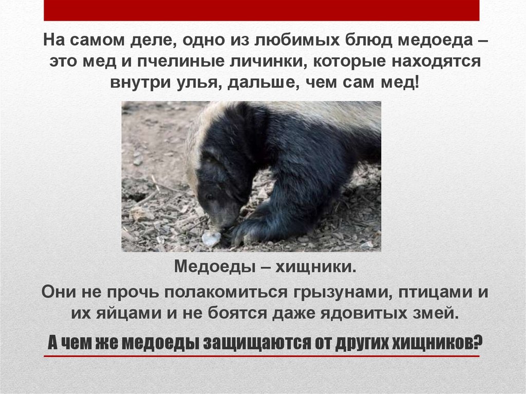 На самом деле, одно из любимых блюд медоеда –это мед и пчелиные личинки, которые находятся