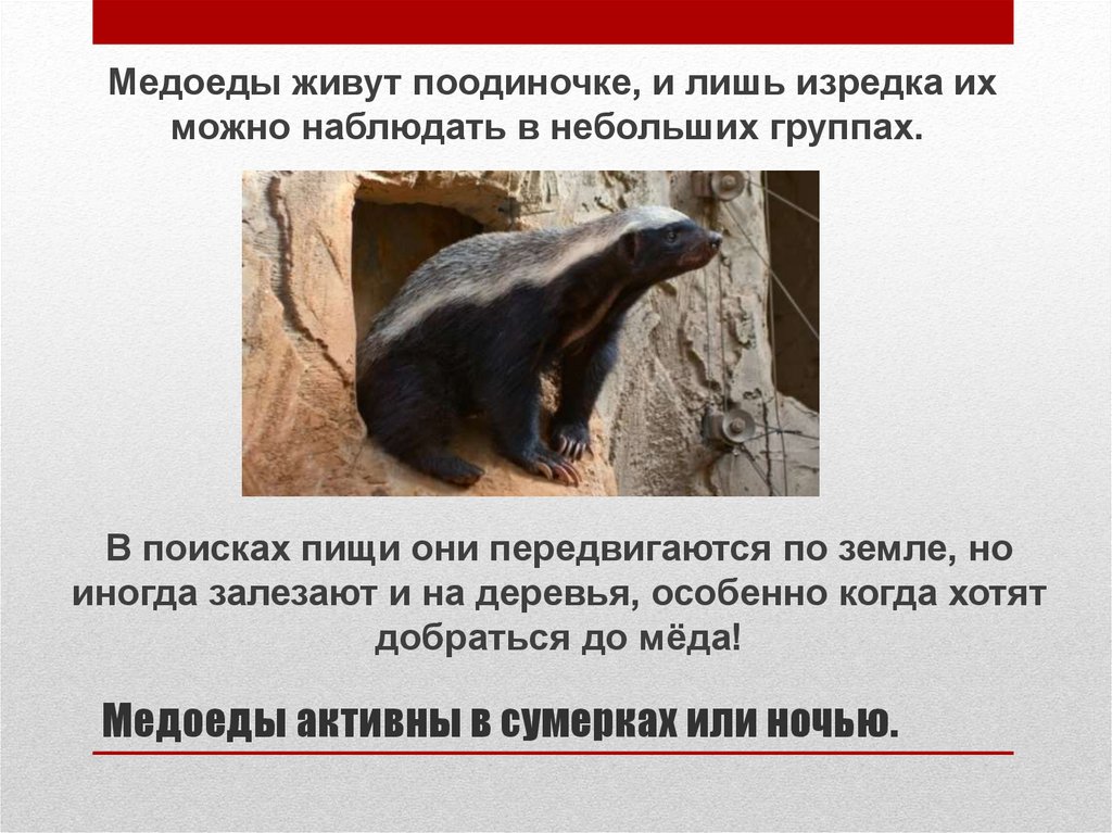 Медоеды живут поодиночке, и лишь изредка ихможно наблюдать в небольших группах.