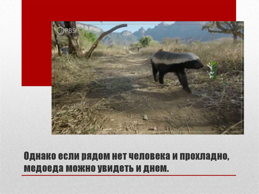 Однако если рядом нет человека и прохладно,медоеда можно увидеть и днем.