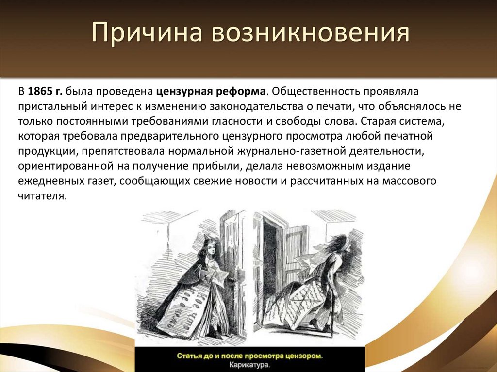Причина возникновенияВ 1865 г. была проведена цензурная реформа. Общественность проявляла
