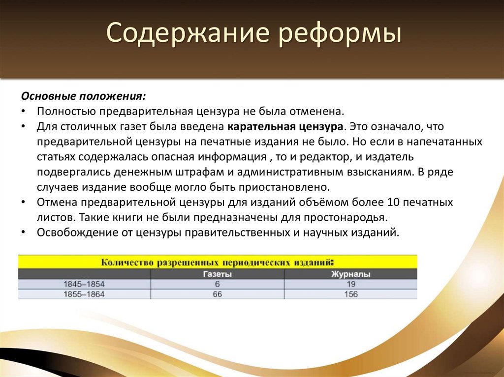 • Отмена предварительной цензуры для изданий объёмом более 10 печатных