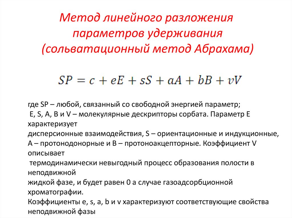 E, S, A, B и V – молекулярные дескрипторы сорбата. Параметр E