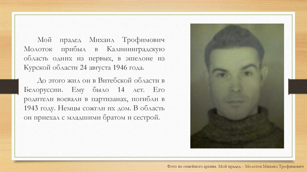 Мой прадед Михаил ТрофимовичМолоток прибыл в Калининградскую