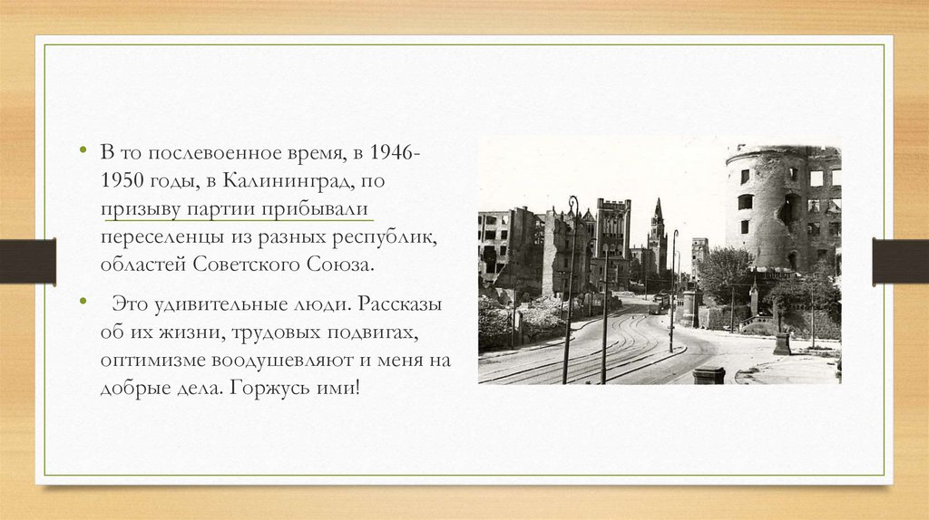 • В то послевоенное время, в 19461950 годы, в Калининград, попризыву партии прибывали