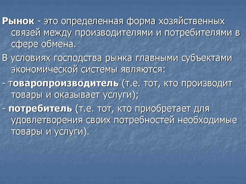 Рынок - это определенная форма хозяйственныхсвязей между производителями и потребителями в