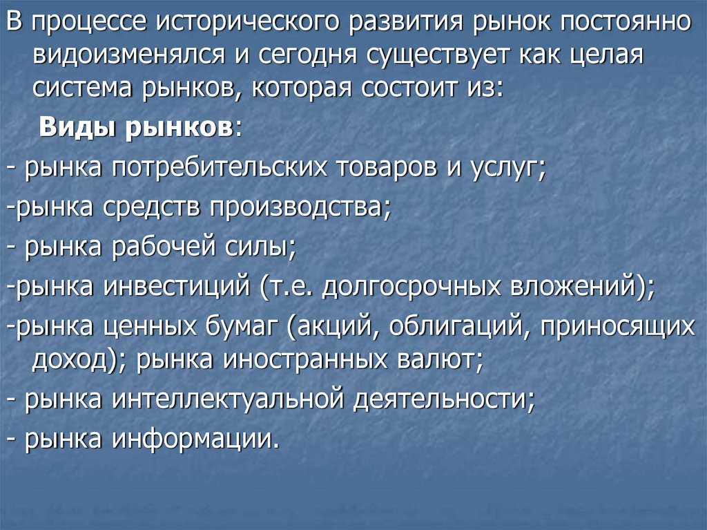 В процессе исторического развития рынок постоянновидоизменялся и сегодня существует как целая