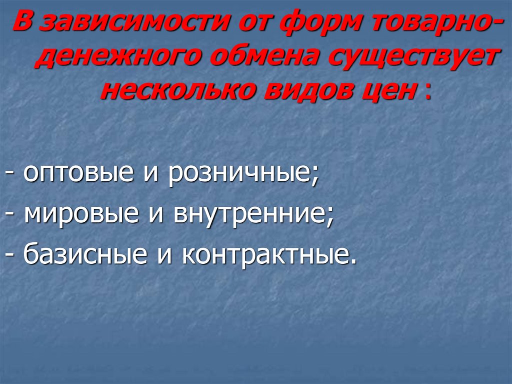 В зависимости от форм товарноденежного обмена существуетнесколько видов цен :