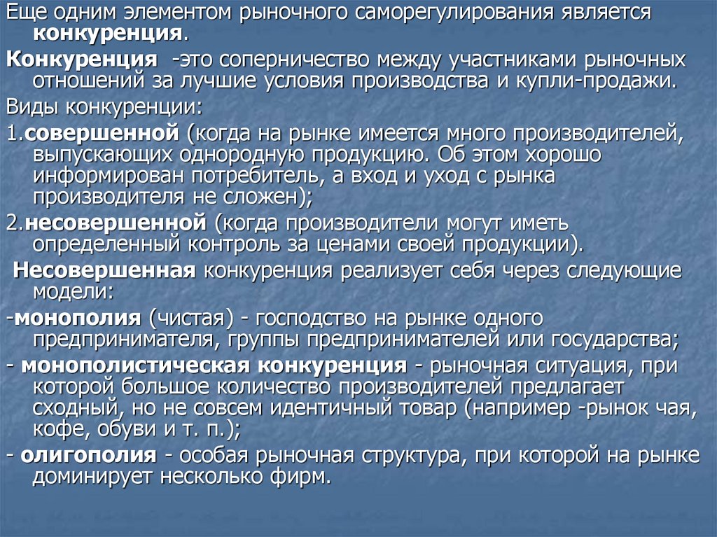 Еще одним элементом рыночного саморегулирования являетсяконкуренция.