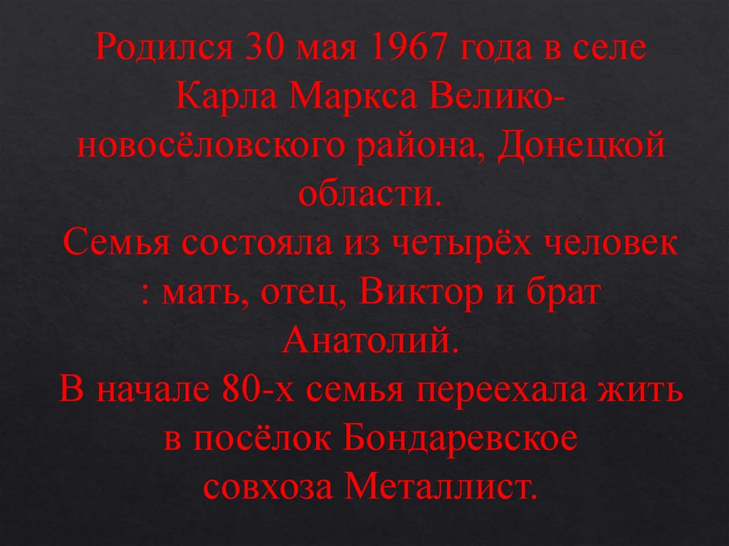 Родился 30 мая 1967 года в селеКарла Маркса Великоновосёловского района, Донецкой