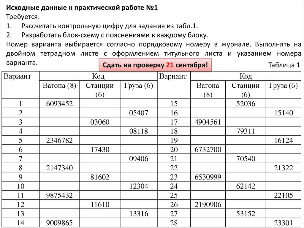 1. Рассчитать контрольную цифру для задания из табл.1.