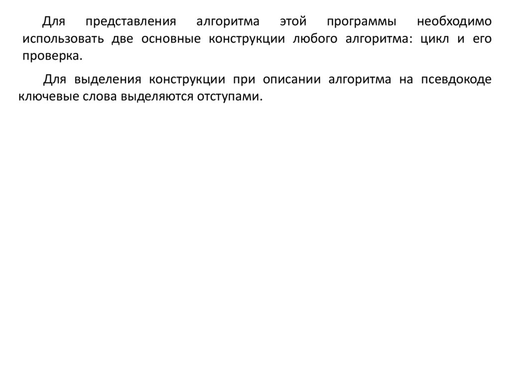 Для представления алгоритма этой программы необходимоиспользовать две основные конструкции любого алгоритма: цикл и его