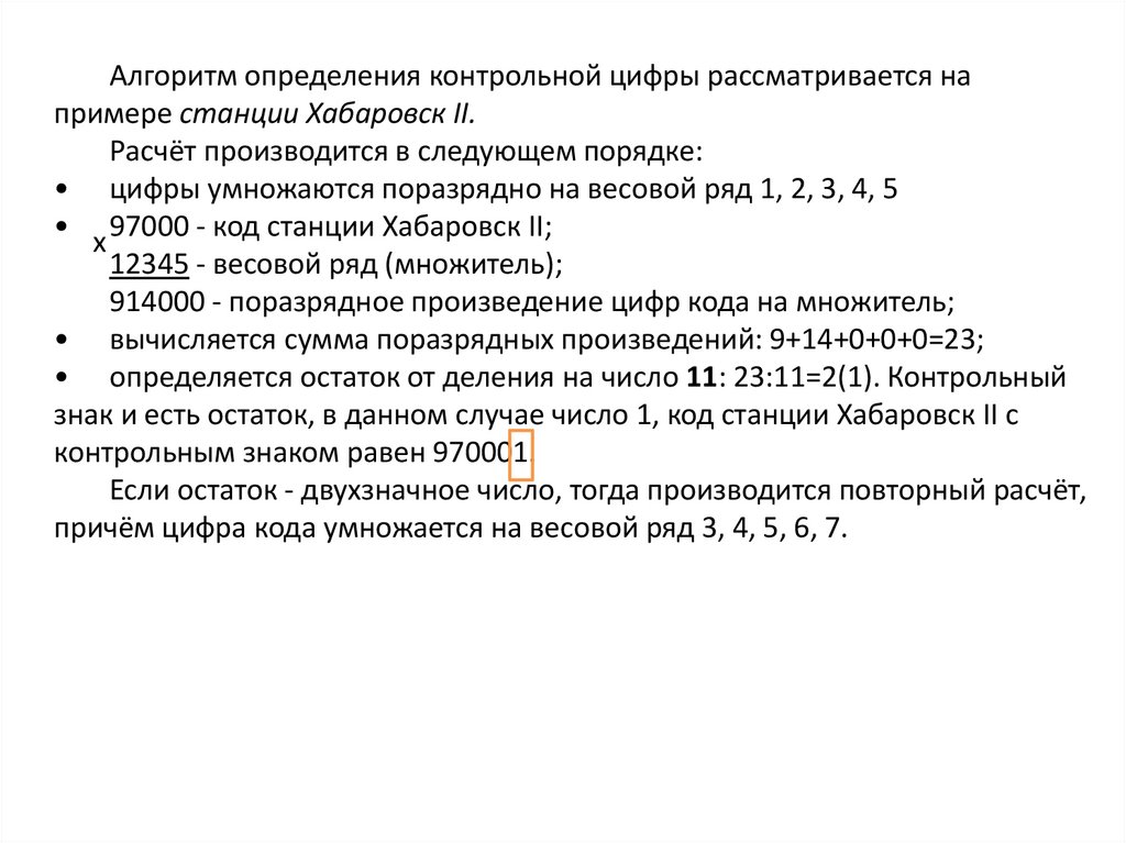 Алгоритм определения контрольной цифры рассматривается напримере станции Хабаровск II.