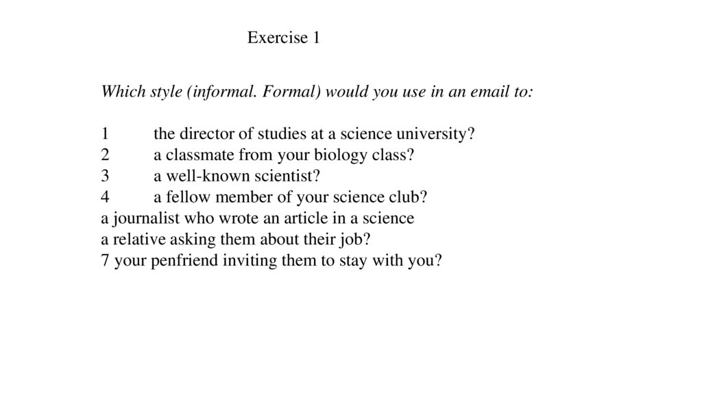 Exercise 1Which style (informal. Formal) would you use in an email to: