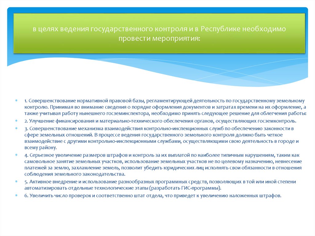 1. Совершенствование нормативной правовой базы, регламентирующей деятельность по государственному земельному