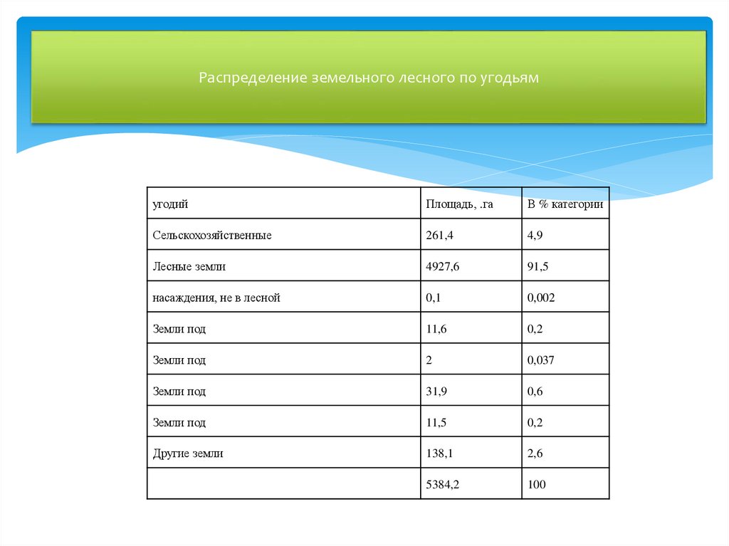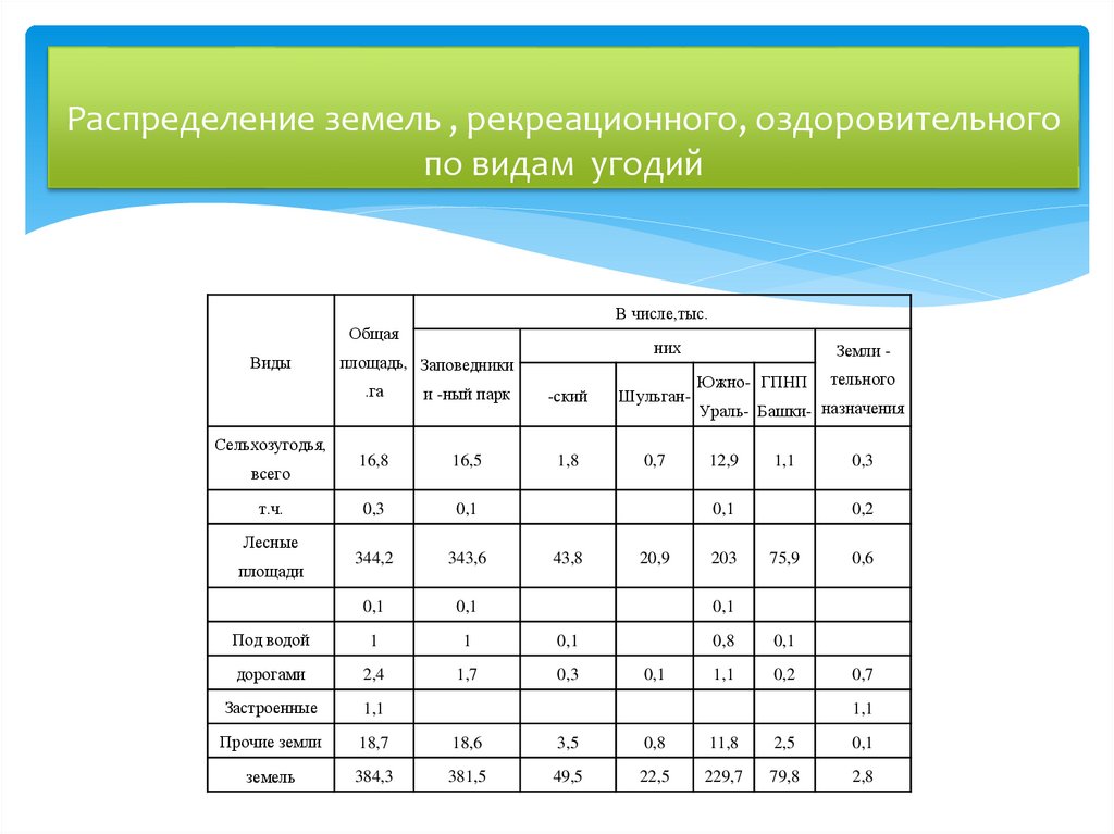 Распределение земель , рекреационного, оздоровительногопо видам угодий