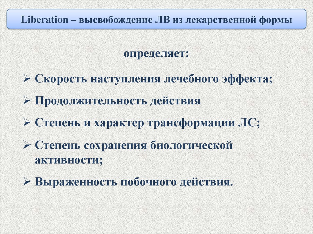 Liberation – высвобождение ЛВ из лекарственной формыопределяет: