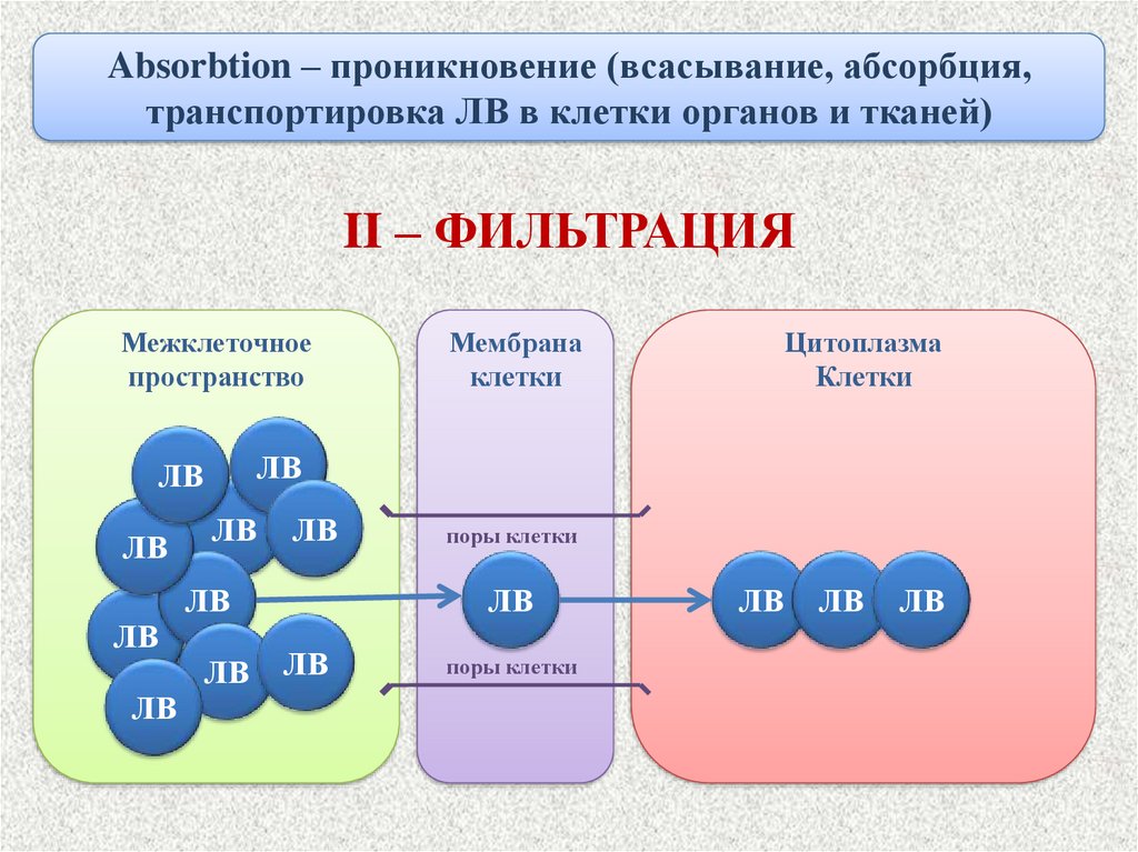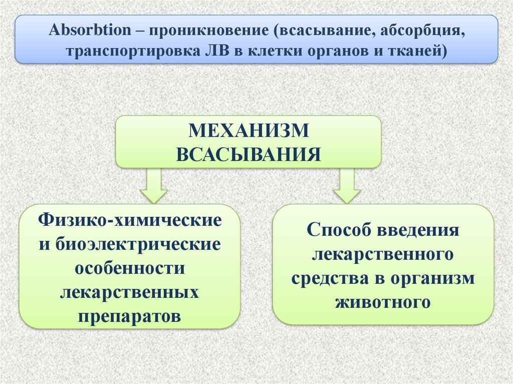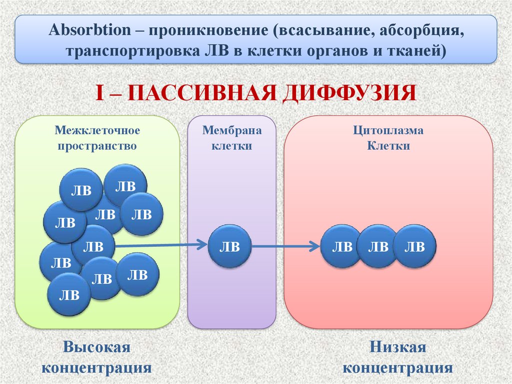 Absorbtion – проникновение (всасывание, абсорбция,транспортировка ЛВ в клетки органов и тканей)