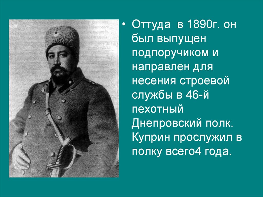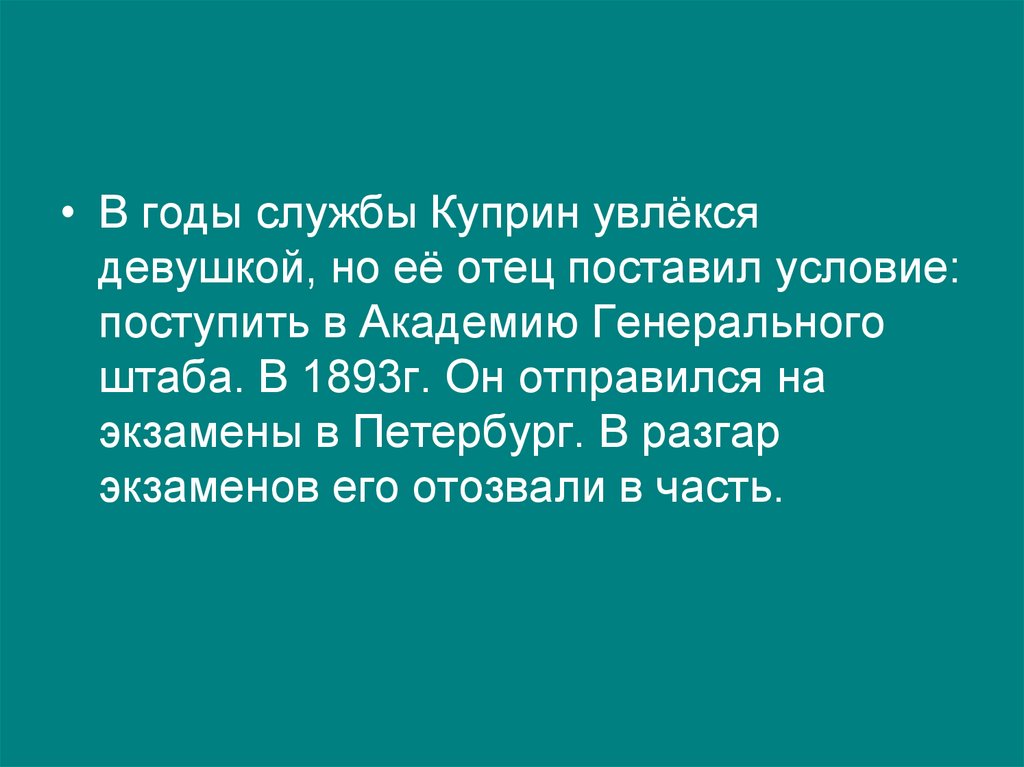 • В годы службы Куприн увлёксядевушкой, но её отец поставил условие: