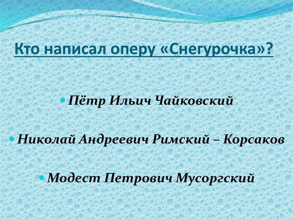 Кто написал оперу «Снегурочка»?Пётр Ильич Чайковский