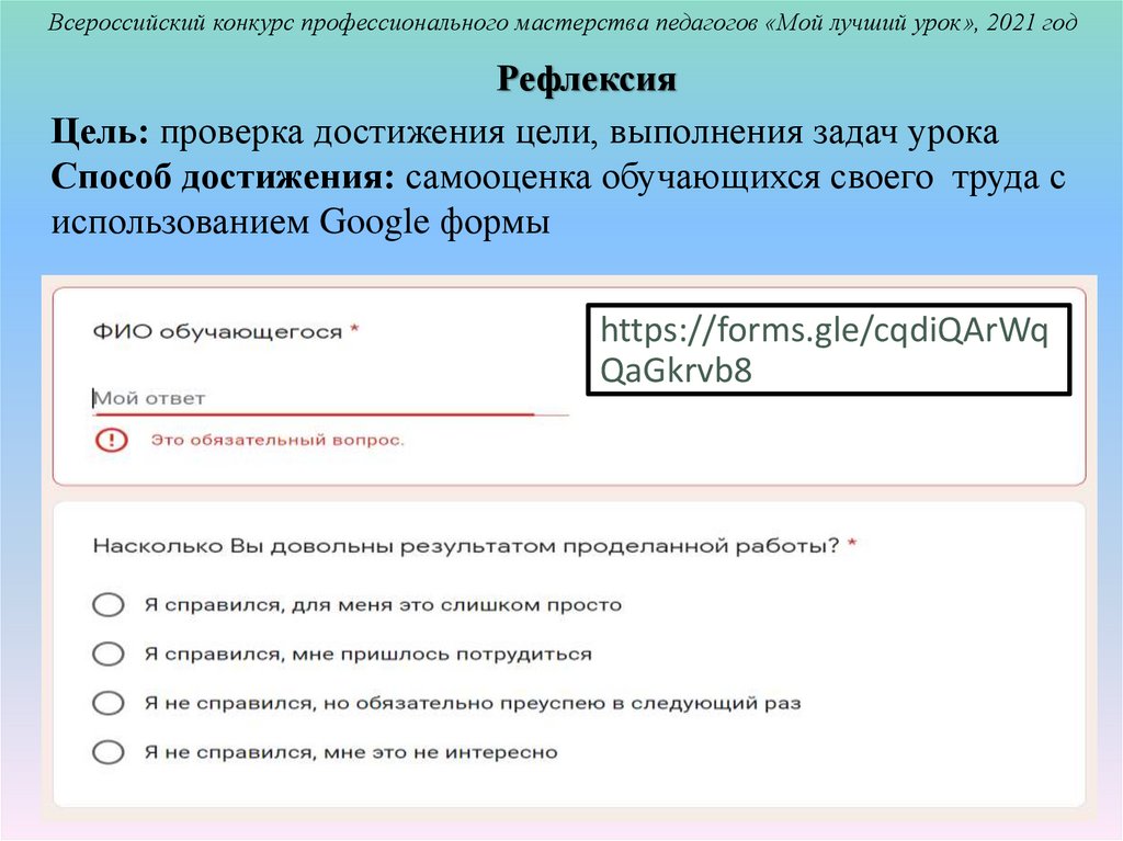 Всероссийский конкурс профессионального мастерства педагогов «Мой лучший урок», 2021 годРефлексия