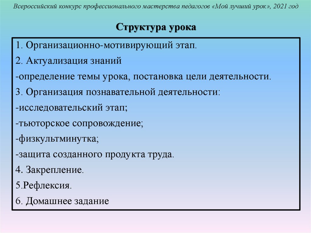 Всероссийский конкурс профессионального мастерства педагогов «Мой лучший урок», 2021 годСтруктура урока