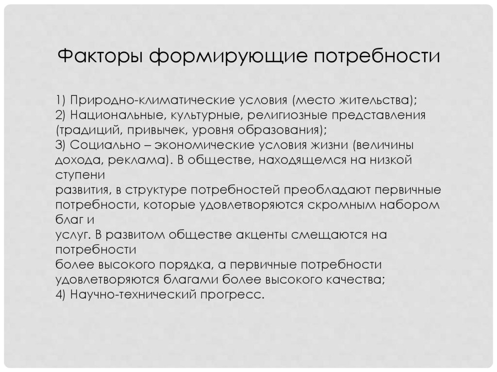 Факторы формирующие потребности1) Природно-климатические условия (место жительства);