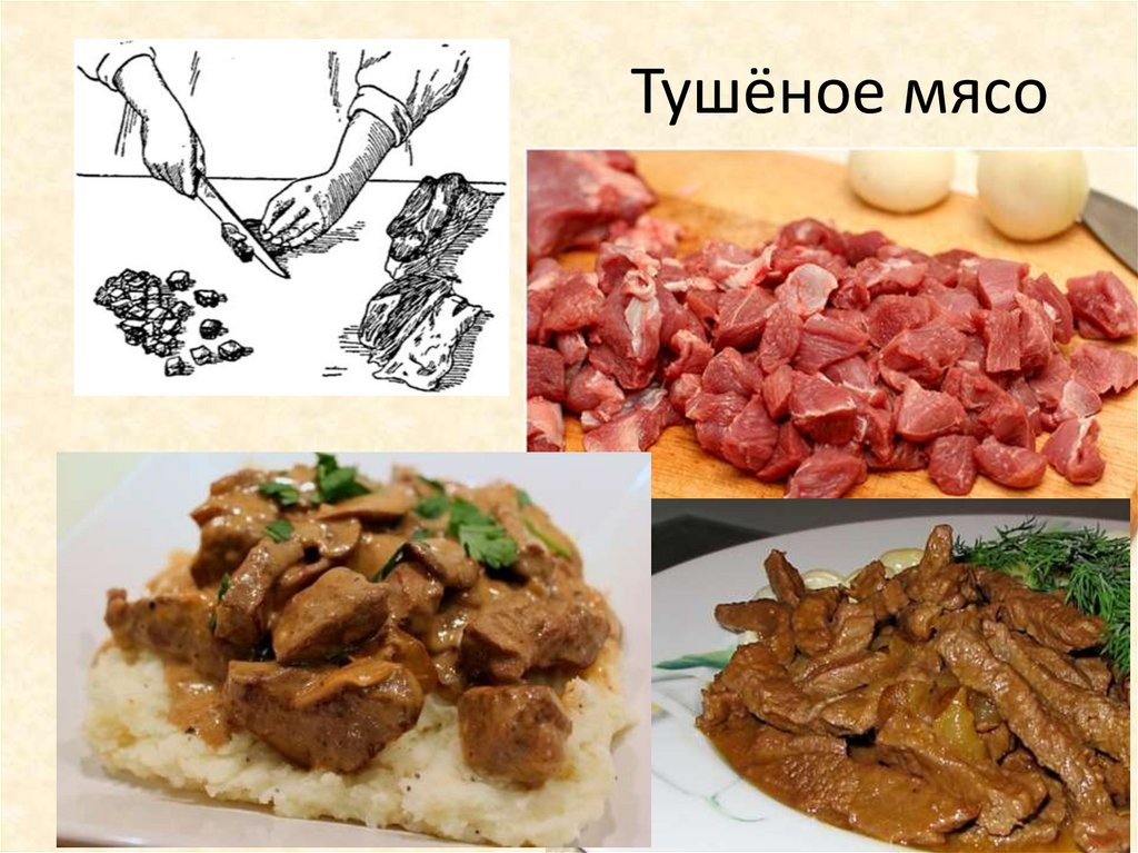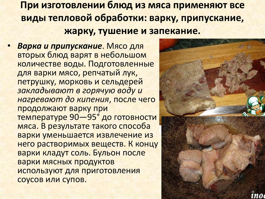 При изготовлении блюд из мяса применяют всевиды тепловой обработки: варку, припускание,
