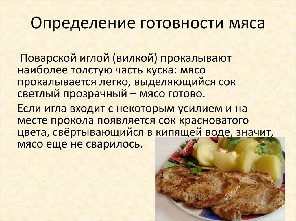 Определение готовности мясаПоварской иглой (вилкой) прокалывают