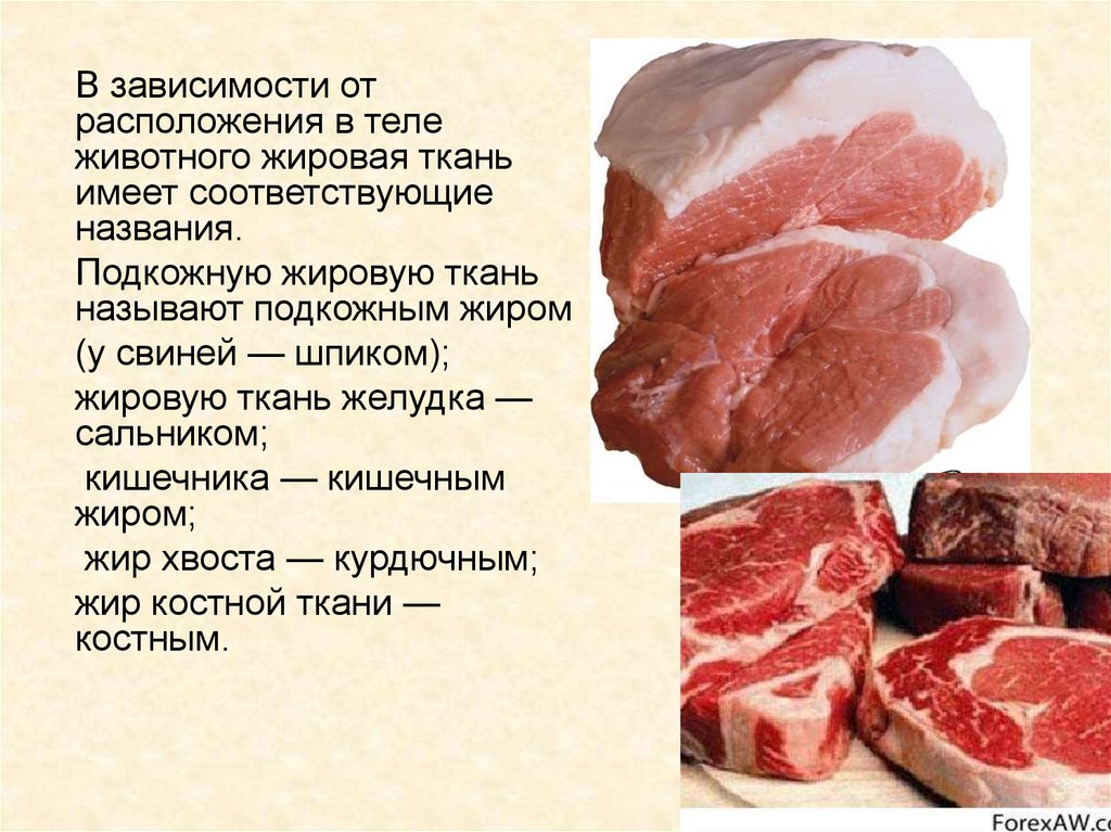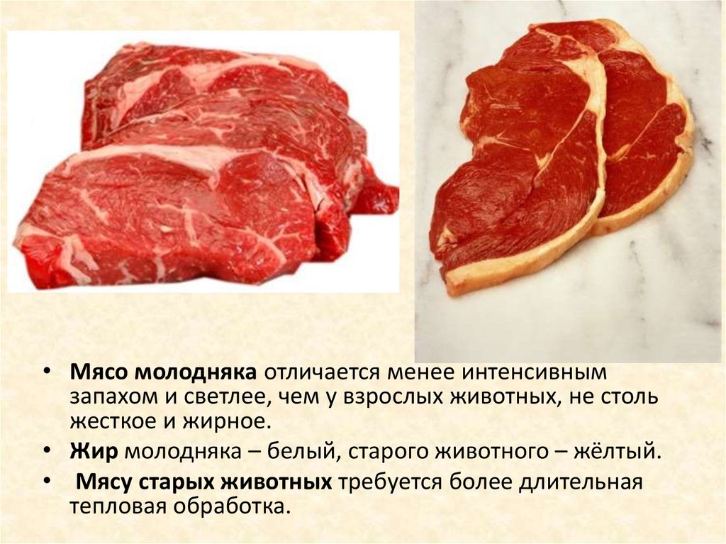 • Мясо молодняка отличается менее интенсивнымзапахом и светлее, чем у взрослых животных, не столь